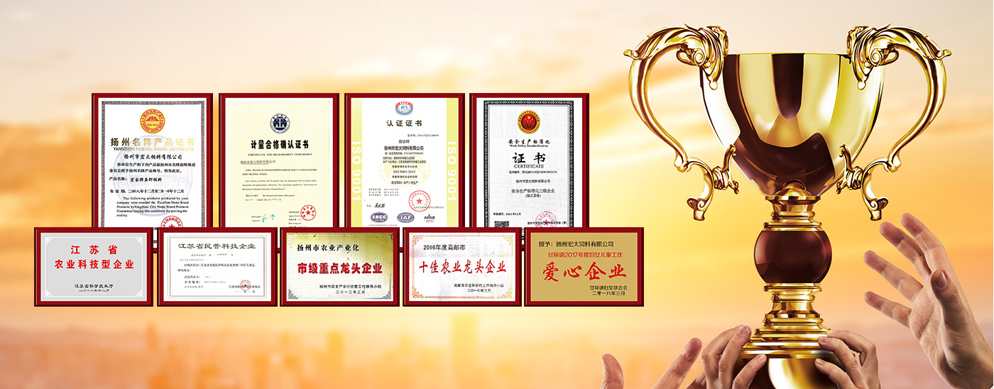 先后榮獲江蘇省飼料質(zhì)量合格產(chǎn)品、江蘇省名牌產(chǎn)品、揚州市消費者滿意商品、揚州市質(zhì)量計量信得過產(chǎn)品等稱號。